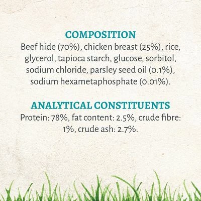 A unique combination of chicken meat and beef rawhide, helping to support dental care through chewing and with an irresistible flavour, free from artificial additives and with just 2% fat.