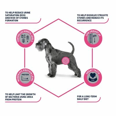 - Dietary complete food for adult dogs to dissolve struvite stones and reduce struvite stone recurrence