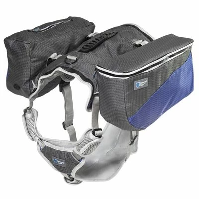 Multifunctional dog harness for hiking, robust and tear-resistant thermo-reflective material, with removable pockets and integrated rain cover, with D-ring and handle, made of polyester