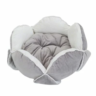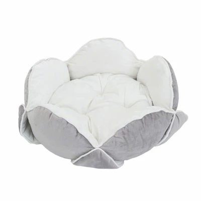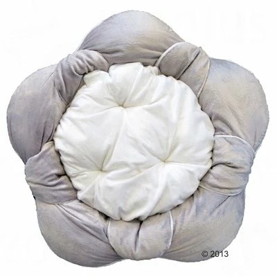 A luxurious pet bed which looks like a flower. With velvety soft petals in white / grey.