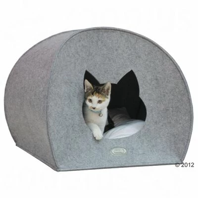 A large, extremely comfortable cat den made from felt. With a cosy, white cushion. Ideal for several cats or larger cat breeds. Colour of den: grey