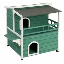 A delightful two-storey cat house made from green lacquered wood, with two spacious dens, a veranda and a weather-proof asphalt sunroof, ideal for use in gardens, on patios and indoor areas.