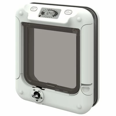 Timer-controlled cat flap made from durable plastic, with five-way rotary-lock for easy and optimum control. In white with an easy-to-read LED-display. Approx. size: 14.5 x 14.5 cm (W x H).