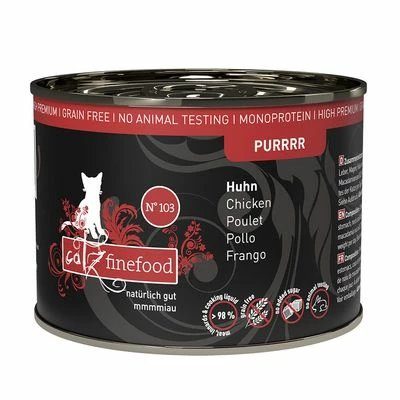 Catz finefood Purrrr is a gourmet wet cat food for cats with food allergies or intolerances. The Purrrr range is easy to digest and made from ingredients that are less likely to cause reactions or symptoms of food intolerance. All of the different varieties are grain free and contain only one single protein source, which also makes these cans suitable for use in exclusion diets.