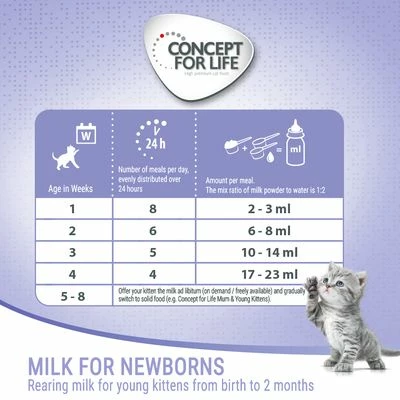 Concept for Life Milk for Newborns is a complete replacement for mother’s milk and provides your little kitten with all the nutrients it needs:
