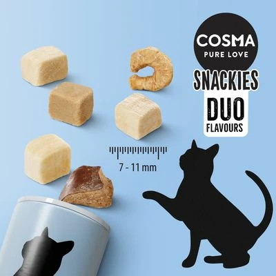 Cosma Snackies DUO cat snacks are a unique product with a very special, natural taste experience which your cat will adore.