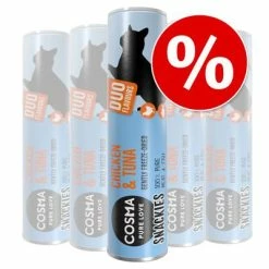 Cosma Snackies DUO are doubly delicious pure, natural cat snacks with an amazing flavour. Every tube contains two different flavours: 100% pure chicken breast combined with either tuna, chicken liver, or shrimps. Even really choosy cats love them.