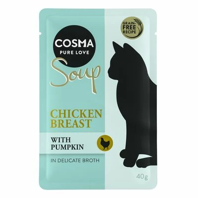 Cosma Soups with chicken, tuna or salmon in a delicate broth come in individual, portion-sized pouches and are the tasty way to show your cat how much you love it. These delicious soups are a supplementary food for cats and not only do they taste good, they are also an additional source of liquid.