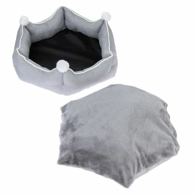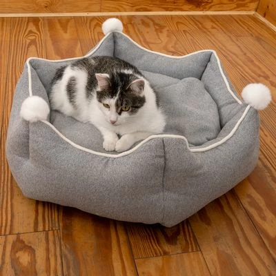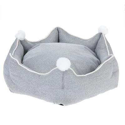 Comfortable Cat Bed similar in design with a Crown, reversable plush cushion with upholstery fabric side and Pom Pom for play. Including a thick floor to insulate from cold floor and edge to lean on.