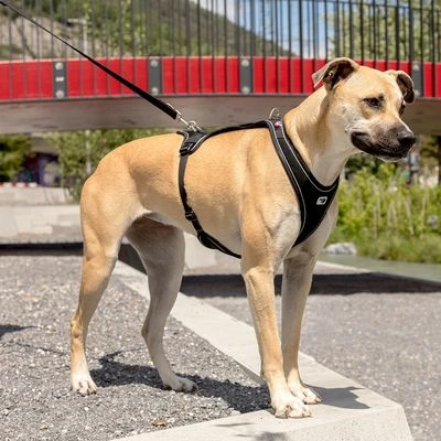 This harness is made of robust polyester and holds its shape well thanks to the wire woven into the seams. It is designed to fit a dog’s shape perfectly and can be adjusted around the chest to suit each individual. The back strap features a handle that is padded with neoprene, making it easy for you to keep hold of your dog if the situation requires. The reflective seams help to improve visibility and safety in darkness.