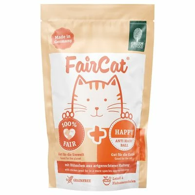 - FairCat Happy: anti-hairball recipe with linseed oil and psyllium husks, tasty species-appropriate chicken.