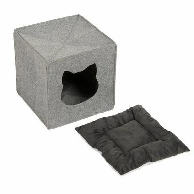 This fun felt cube acts as the perfect hideaway den for your cat. It is foldable with dual-colour reversible cushions that can be easily removed. It fits perfectly on shelves & is washable up to 30°C.