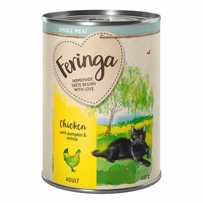 Feringa Single Meat Menus place great importance on top class ingredients: 75% meat or fish & offal, from just one source of protein and choice garden vegetables and herbs. These delicious grain-free recipes are species-appropriate and made without any artificial colours, aromas or preservatives. The carefully selected ingredients are combined to create a very tasty meal for your cat that only tastes of the ingredients named on the label.