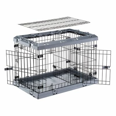 Dog cage for home or travel, stable and robust, double locking and folding roof, drainage system for dry floor, easy to fold and transport, made of metal and plastic