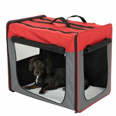 Foldable transport crate, ideal at home or when out and about, two mesh doors, frame supported with metal bars, easy assembly, good air circulation, with side pockets and cushion, made from nylon