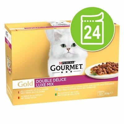 A luxurious meal for real gourmands, this Gourmet Gold Double Delicacies Saver Pack 24 x 85g offers a mix of delicious wet food that will satisfy even the fussiest of cats. Tender chunks of meat, fish or poultry are served in an appetising gravy. It contains only selected beneficial ingredients.
