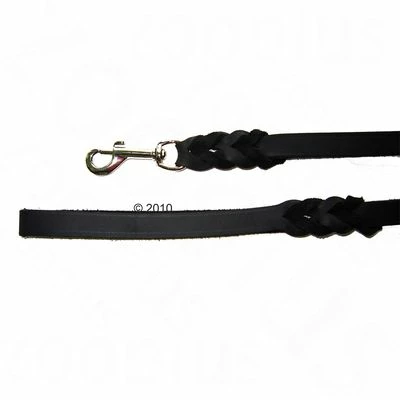 Leather dog lead, plaited to secure snap hook, made from oiled black leather.