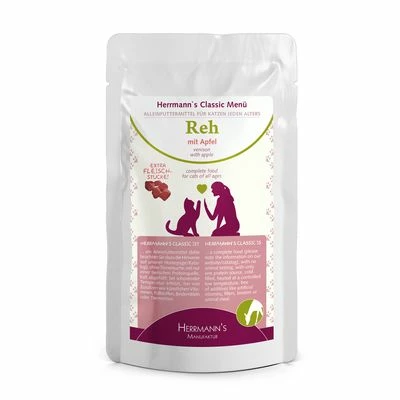 Herrmann’s Menu, with its easy-to-digest organic carbohydrates (organic rice, organic quinoa, organic kamut) and extra portion of organic vegetables (organic spinach, organic pumpkins, organic carrots), is complete nutrition for every cat – gently steamed.