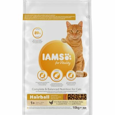 The balanced recipe of IAMS for Vitality Adult Hairball Reduction Fresh Chicken Dry Cat Food is designed to meet the nutritional needs of adult cats between the ages of 1-6 years that suffer with regular hairballs. The special mix of fibres in this high-quality dish helps swallowed hairs to move through your cat’s digestive tract. High-quality ingredients and prebiotic FOS ensures digestibility and a balanced intestinal flora., Omega-6 and -3 fatty acids support healthy skin and glossy coat.