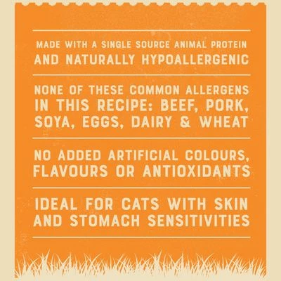 This tasty complete wet food for adult cats is grain-free and hypo-allergenic. Made using only one source of animal protein it is suitable for cats for food intolerances.