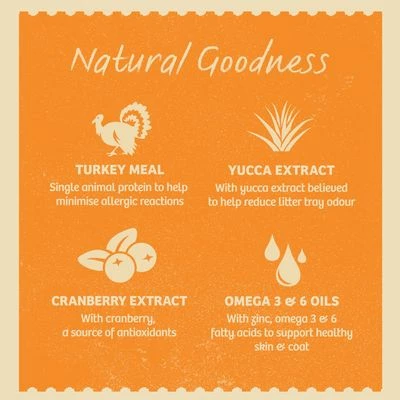 James Wellbeloved Adult in pouches is a balanced, tasty wet food, suitable for all adult cats, including those which suffer with allergies or sensitive digestive systems. It is hypoallergenic and avoids ingredients known to cause many food intolerances such as pork, eggs, dairy and beef. It is also wheat, gluten and soya free. The carbohydrates come from delicious cassava and potato and tasty turkey is the only source of animal protein. This appetising, easy to digest wet cat food does not contain artificial colours, preservatives or taste enhancers. Made from wholesome, natural products, it is enriched with linseed oil. Rich in unsaturated fatty acids, it helps to support healthy skin and shiny fur. Chicory extract contains prebiotic inulin which is good for your pet’s digestive system and helps to maintain a balanced gut flora. Yucca extract can help to reduce stool odour. This delicious moist food uses only the very best ingredients and is enriched with vital minerals and vitamins.