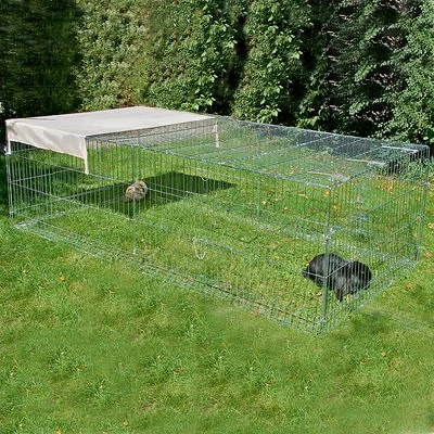 A large, 4-sided run with unique escape barrier. For rabbits, guinea pigs. Galvanised metal, bar spacing 3.5 cm. Includes sun protection shield.