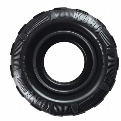 A tyre shaped KONG chew toy for your dog, made of durable natural rubber perfect for chewing. Make this robust dog toy extra exciting by filling it with your dog’s favourite treats! Colour: black.
