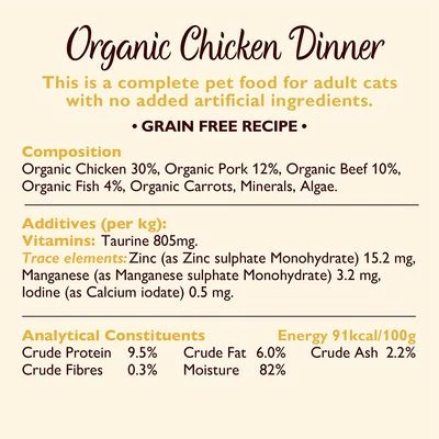 This balanced, grain-free cat food is made with organic ingredients from 100% controlled organic farms including fresh, free-range organic chicken, vitamins and taurine for a complete meal.