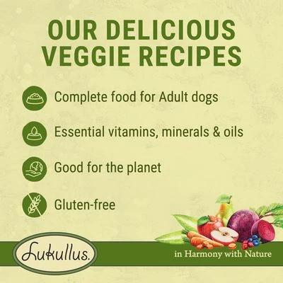 The natural recipe contains only carefully selected vegetarian ingredients and the combination of wholesome vegetables and vitamin-rich fruit can help to provide your dog with many essential vitamins, minerals and trace elements. Lukullus is gluten-free and free from preservatives and genetically modified ingredients.