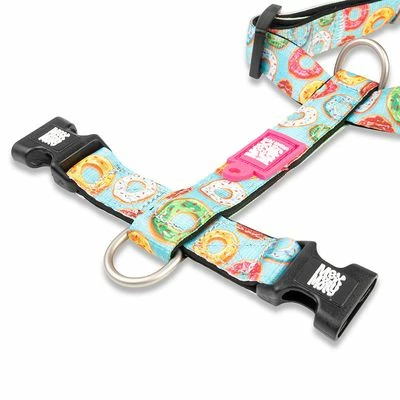 Adjustable dog harness with colourful donut print, alter the size to fit your pup, double-layered design, very sturdy clips, 2 D-rings, made of neoprene and polyester