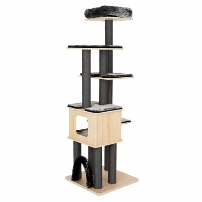 Stylish scratching tree with a contrasting design, with light wood and dark covers and posts, offering a cosy den and cuddle bed with long scratching posts, as well as massage brushes.