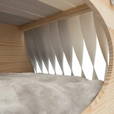 The inside of the bed can be designed to be darker or flooded with light, for a changing appearance as well as atmosphere for your cat. The wide bands invite your cat to explore and play.