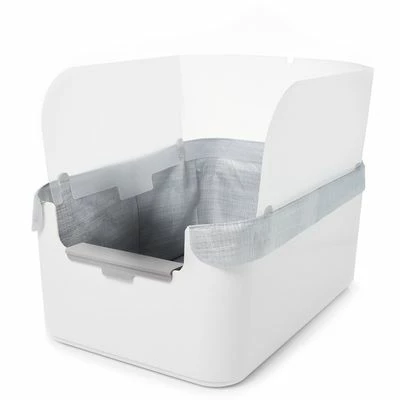 A high, open cat tray with additional step for climbing in and out, reusable litter tray liner, includes a transparent splashguard to ensure a clean environment, modern design, colour: white/grey