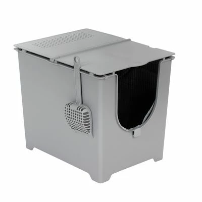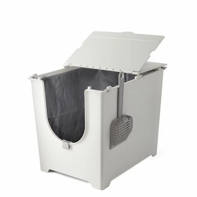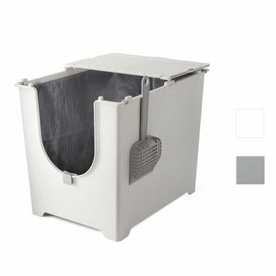 Roomy, high-sided cat litter box with front entry. The lid folds back to reveal a removable tarp that makes the litter box very easy to clean, and it comes with a matching scoop, clips and hooks.