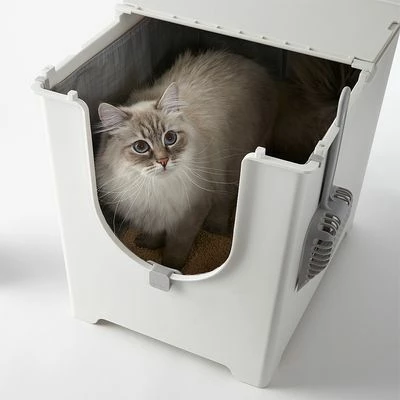 The product includes a useful tarpaulin sheet, that fits inside the litter box (attached with clips), and makes it even easier to change the cat litter. The front entrance to the box measures 20 x 25cm. The litter box has very high sides and is made from one complete piece of plastic, to reduce the risk of spillage or litter escaping from the box. This clever litter tray has a modern design to blend into your home environment, whilst maintaining cleanliness and hygiene.