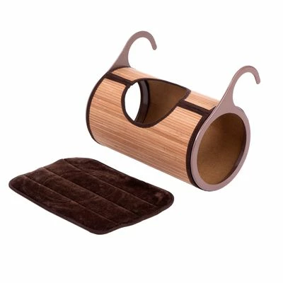 Cuddly cat den made from natural bamboo, with 3 different entrances and a removable, washable plush cushion. It is easy to assemble and sits on your radiator to offer comfort and warmth.