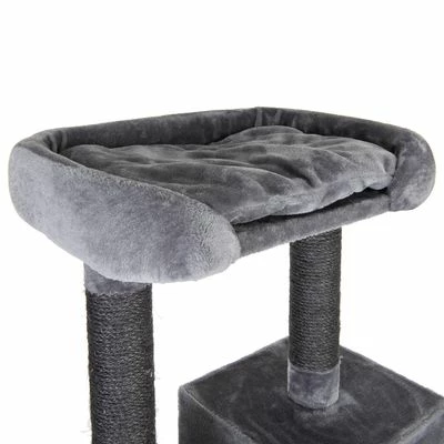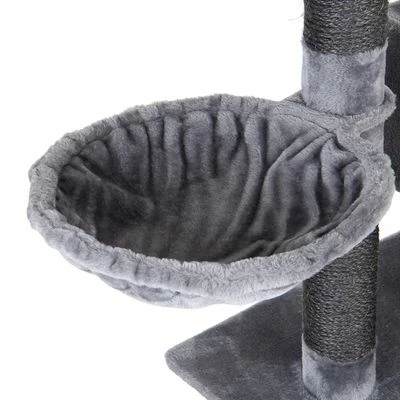 Robust scratching tree in an elegant grey, ideal for larger breed cats and with 3 padded sleeping areas and platforms, with a large cuddle bed and den, as well as a swivelling hammock.