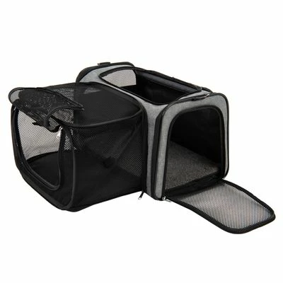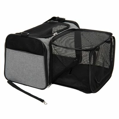 Lightweight carry case for cats and small dogs up to 12kg, with a foldable net run and adjustable carry handle, with mesh for good circulation and with a large roof opening.