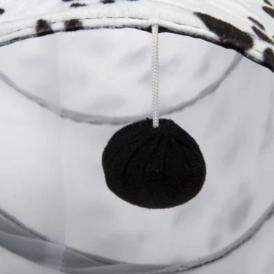 This cat tunnel is covered in soft, cosy material with a cute black paw pattern. It has a rustle layer and a little toy ball for added fun. There is a middle entrance and it folds away to save space.