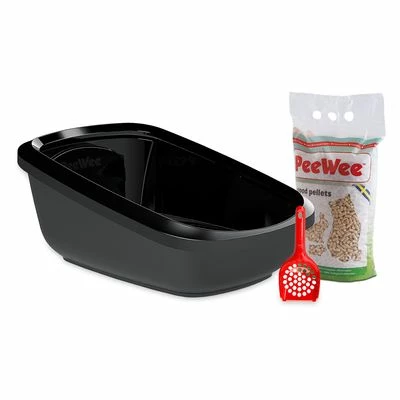 - Litter tray for large and very large cat breeds, with a litter scoop and environmentally friendly wood litter