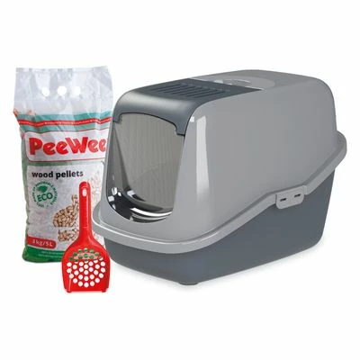 - Hooded litter tray for cats with a litter scoop and environmentally friendly wood litter