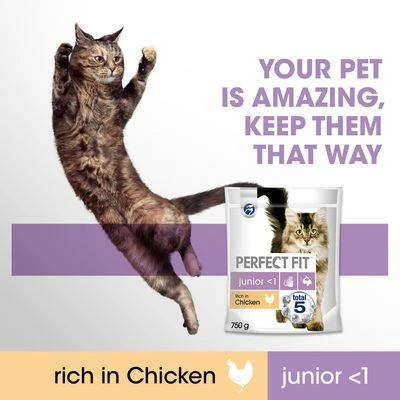 Perfect Fit Junior <1 Rich in Chicken dry cat food tastes delicious and provides young cats with a balanced combination of nutrients. Only premium quality ingredients, free from colouring and preservatives, are used in Pure Fit. Important proteins, fats and carbohydrates and an optimal balance of vitamins and minerals make this meal as close as possible to the diet your cat would enjoy in the wild.
