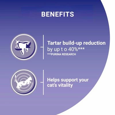 The tasty recipe also helps to boost your cat’s overall wellbeing with a combination of important nutrients. The Bifensis Dual Defense formula is designed to support your cat’s natural defences and was developed by Purina’s experts in veterinary science and pet nutrition. It gives your cat a health boost inside and out. The Bifensis formula has been proven to help your cat’s intestinal immune system to work harder and produce powerful antibodies. The crunchy kibble can also help to reduce tartar build-up by up to 40% and the balanced mix of minerals supports a healthy urinary tract. Vitamin D and other important nutrients help to ensure that your cat’s bones are strong and healthy.