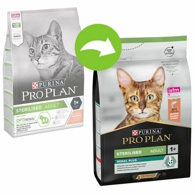 PURINA PRO PLAN Sterilized Adult Renal Plus – Salmon is a complete diet for adult neutered cats, made with salmon and tuna to keep the urinary tract healthy and an ideal body weight, as well as immune system.