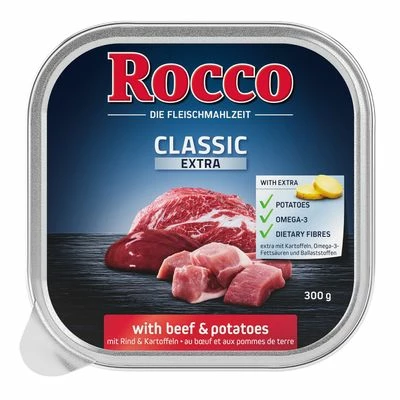 Tasty Rocco wet dog food in handy trays, now in a great value saver pack!. These tasty, species-appropriate wet dog food trays contain added Omega-3 and fibre for healthy digestion & a shiny coat.