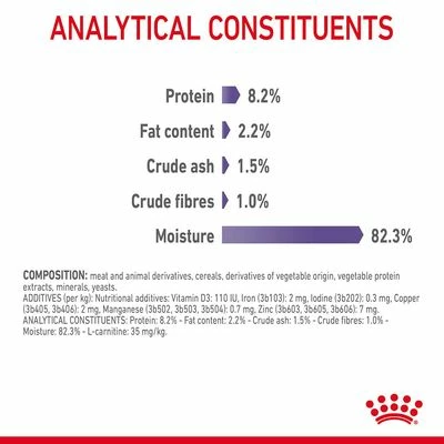 Royal Canin Appetite Control Care in Gravy is a complete and balanced formula specially formulated to reduce begging behavior. This can happen after castration, for example. An optimal combination of soluble and insoluble fiber promotes an early feeling of satiety. In combination with a moderate fat and high protein content the wet food can contribute to maintaining the ideal weight and muscle mass.