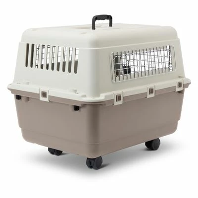 Transport box for dogs, ideal for flights and IATA compliant, with air vents to ensure circulation, with a security closure system and mounted on wheels for easy manoeuvring.