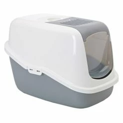The covered corner litter box has a moulded grip at the top to make it easy to move, and is available in either white and grey or white and blue.