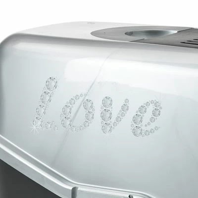 A covered designer litter box with a “Love” print. With a high tray, and hinged front, including an active carbon filter and lowered entrance. Dimensions: 56 x 39 x 38.5 cm (L x W x H).