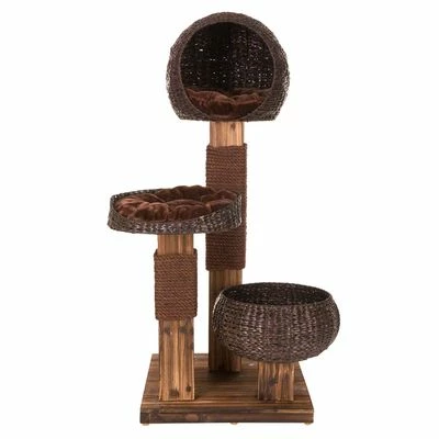 An elegant cat tree with a contemporary “burned” wood effect. It has solid wood cladding and the beautiful water hyacinth baskets have washable cushions. Dimensions: 58 x 58 x 139 cm (L x W x H).